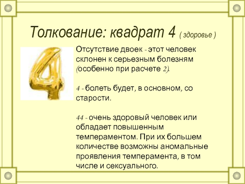 Слайд 21Толкование: квадрат 4 ( здоровье )