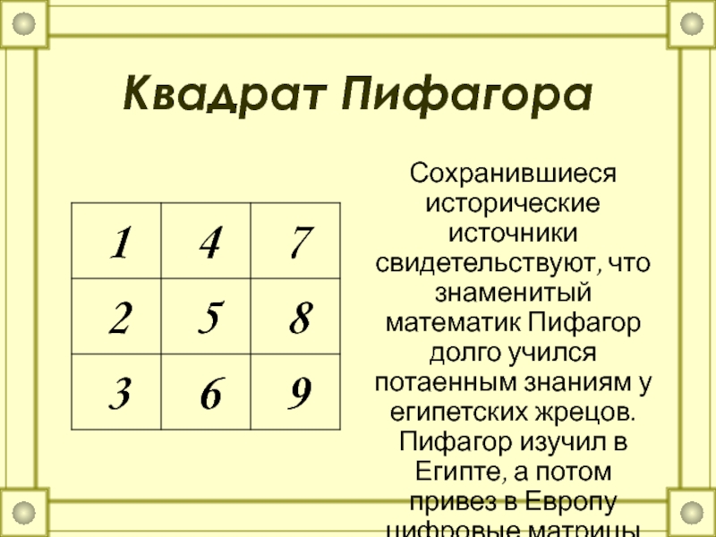 потаенным знаниям у египетских жрецов. Пифагор изучил в Египте, а потом привез в Европу цифровые матрицы