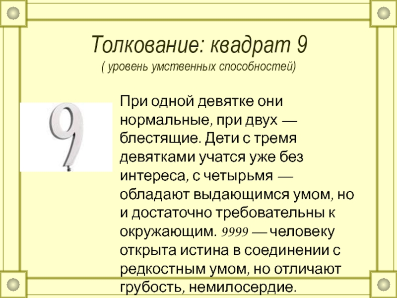 при двух — блестящие. Дети с тремя девятками учатся уже без интереса, с четырьмя — обладают выдающимся умом, но и достаточно требовательны к окружающим. 9999 — человеку открыта истина в соединении с редкостным умом, но отличают грубость, немилосердие.