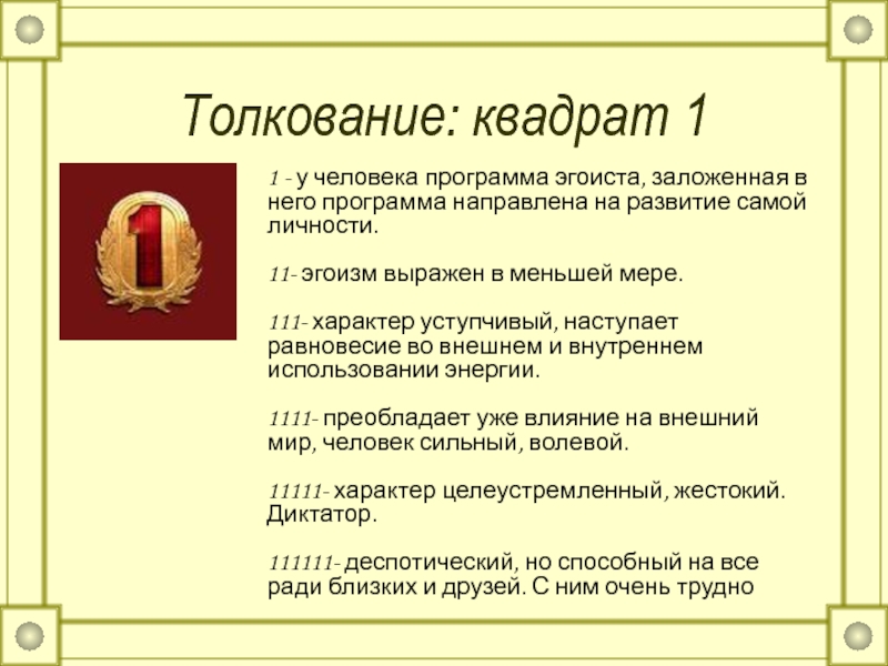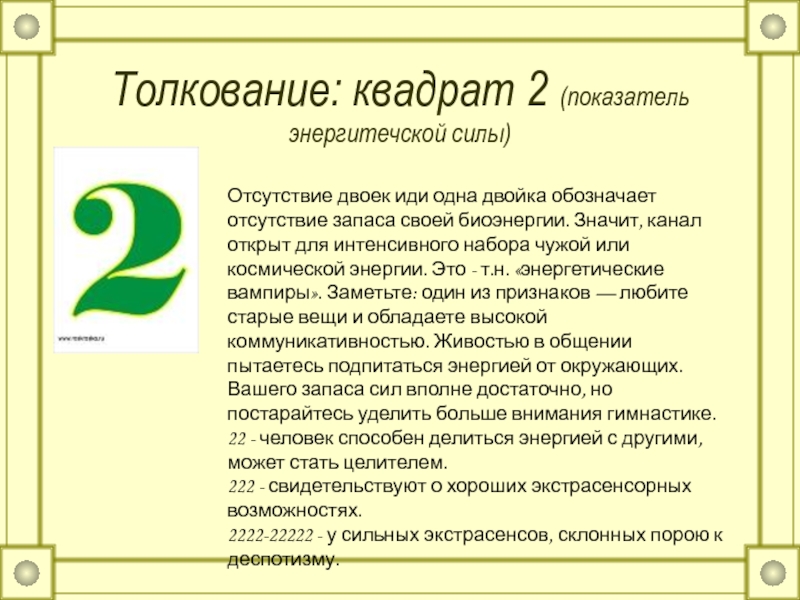 Слайд 19Толкование: квадрат 2 (показатель энергитечской силы)