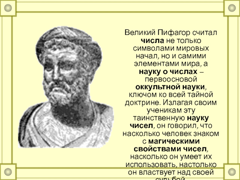 самими элементами мира, а науку о числах – первоосновой оккультной науки, ключом ко всей тайной доктрине. Излагая своим ученикам эту таинственную науку чисел, он говорил, что насколько человек знаком с магическими свойствами чисел, насколько он умеет их использовать, настолько он властвует над своей судьбой.