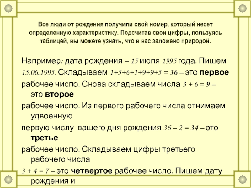 Слайд 16Все люди от рождения получили свой номер, который несет определенную характеристику.