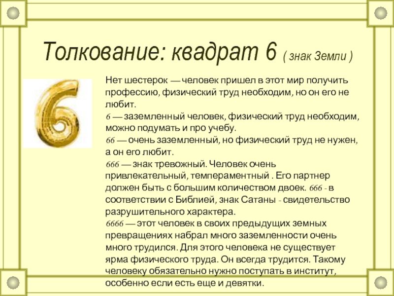 Слайд 23Толкование: квадрат 6 ( знак Земли )