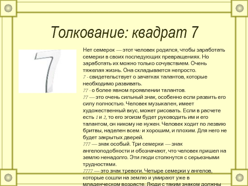 7 - свидетельствует о зачатках талантов, которые необходимо развивать.