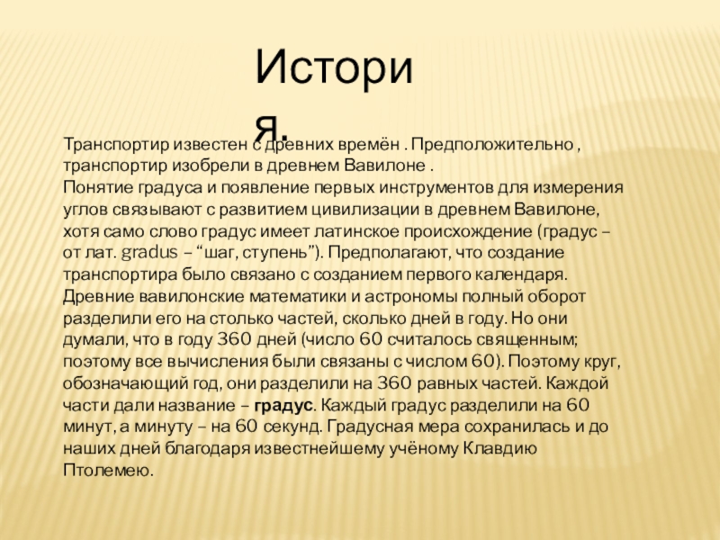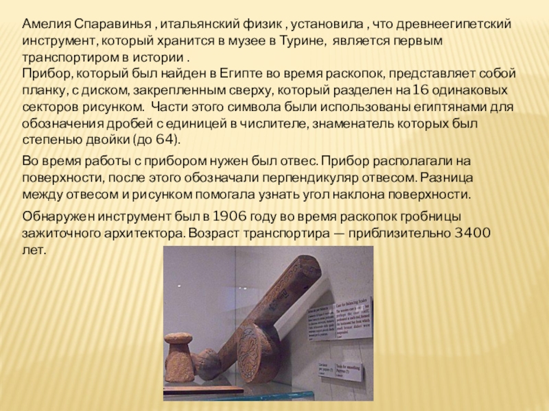 Обнаружен инструмент был в 1906 году во время раскопок гробницы зажиточного архитектора. Возраст транспортира — приблизительно 3400 лет.