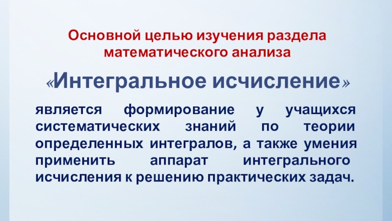 учащихся систематических знаний по теории определенных интегралов, а также умения применить аппарат интегрального исчисления к решению практических задач.