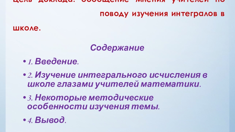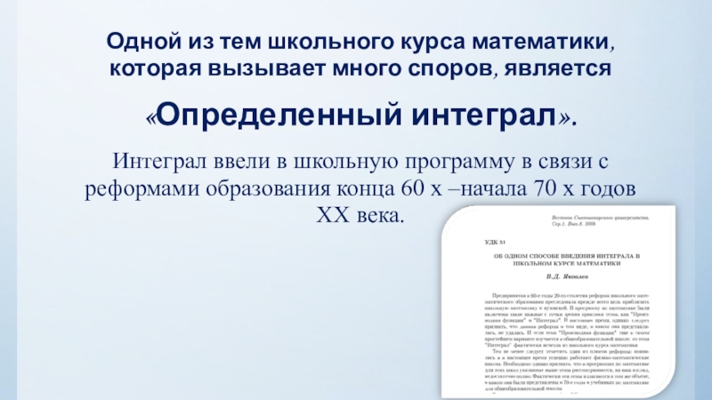 Интеграл ввели в школьную программу в связи с реформами образования конца 60 х –начала 70 х годов XX века.