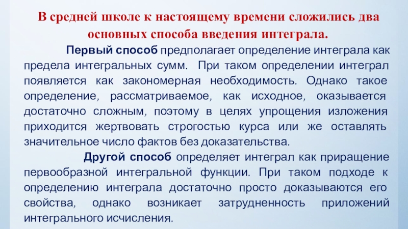 Первый способ предполагает определение интеграла как предела интегральных сумм. При таком определении интеграл появляется как закономерная необходимость. Однако такое определение, рассматриваемое, как исходное, оказывается достаточно сложным, поэтому в целях упрощения изложения приходится жертвовать строгостью курса или же оставлять значительное число фактов без доказательства.