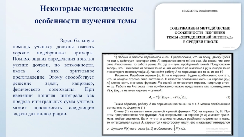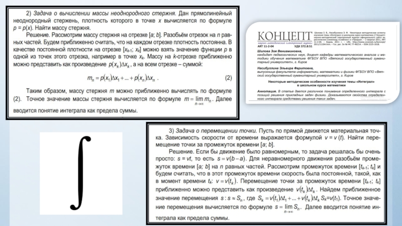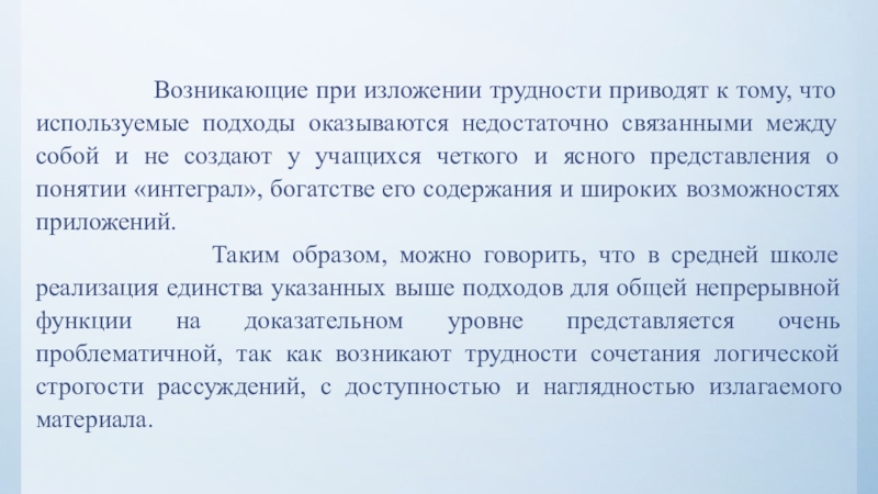 трудности приводят к тому, что используемые подходы оказываются недостаточно связанными между собой и не создают у учащихся четкого и ясного представления о понятии «интеграл», богатстве его содержания и широких возможностях приложений.