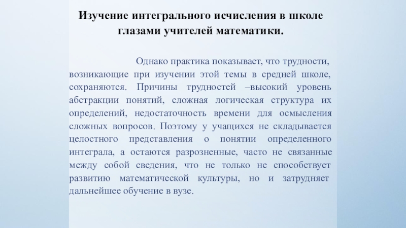 Однако практика показывает, что трудности, возникающие при изучении этой темы в средней школе, сохраняются. Причины трудностей –высокий уровень абстракции понятий, сложная логическая структура их определений, недостаточность времени для осмысления сложных вопросов. Поэтому у учащихся не складывается целостного представления о понятии определенного интеграла, а остаются разрозненные, часто не связанные между собой сведения, что не только не способствует развитию математической культуры, но и затрудняет дальнейшее обучение в вузе.