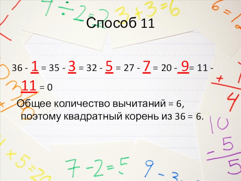 Общее количество вычитаний = 6, поэтому квадратный корень из 36 = 6.