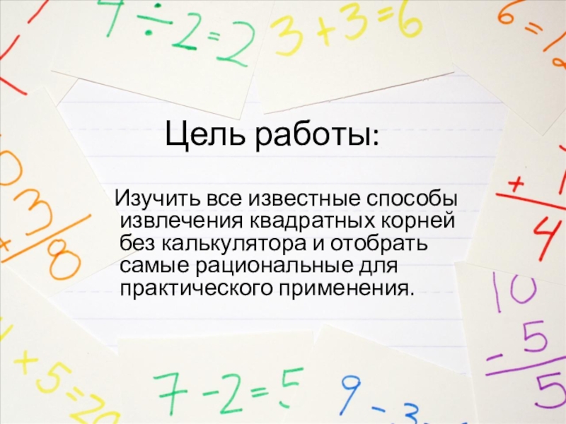 Цель работы:  Изучить все известные способы извлечения квадратных корней без калькулятора и отобрать самые рациональные для