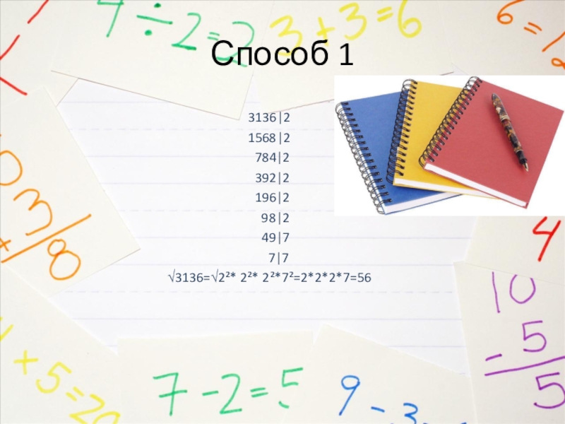 Способ 13136|21568|2 784|2 392|2 196|2  98|2  49|7   7|7√3136=√2²* 2²* 2²*7²=2*2*2*7=56