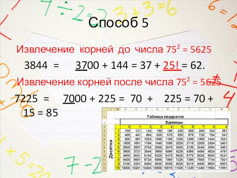 Способ 5 Извлечение корней до числа 752 = 5625  3844 =   3700 + 144