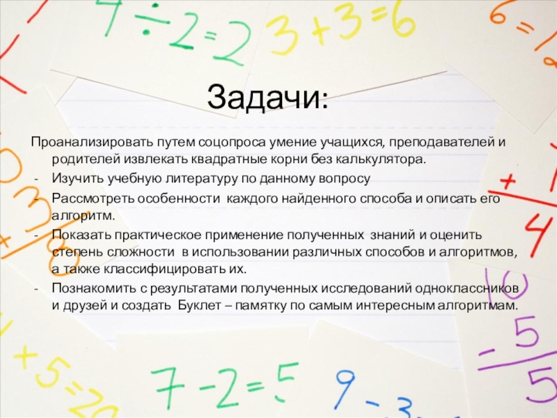 Задачи: Проанализировать путем соцопроса умение учащихся, преподавателей и родителей извлекать квадратные корни без калькулятора. Изучить учебную литературу