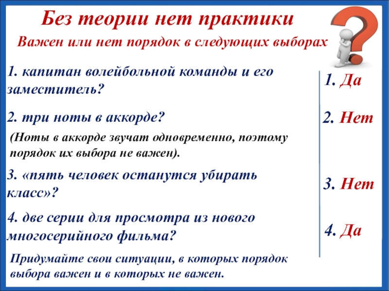 Придумайте свои ситуации, в которых порядок выбора важен и в которых не важен.