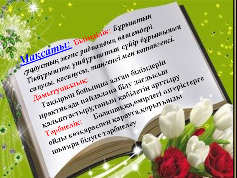 Слайд 3Мақсаты: Білімділік: Бұрыштың градустық және радиандық өлшемдері. Тікбұрышты үшбұрыштың сүйір бұрышының