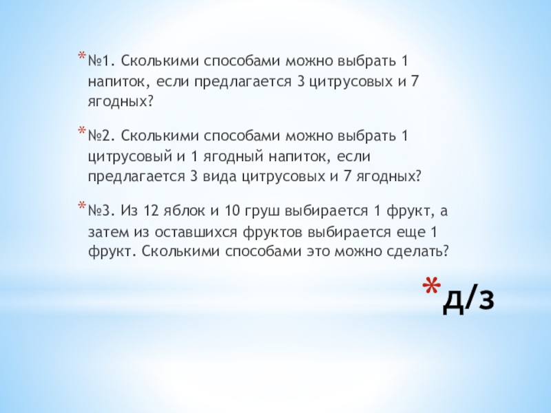 №1. Сколькими способами можно выбрать 1 напиток, если предлагается 3 цитрусовых