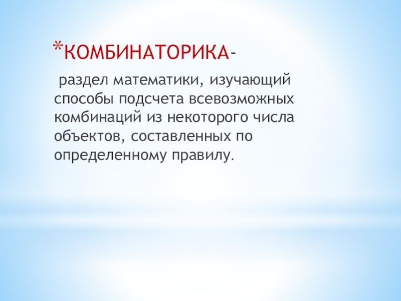раздел математики, изучающий способы подсчета всевозможных комбинаций из некоторого числа