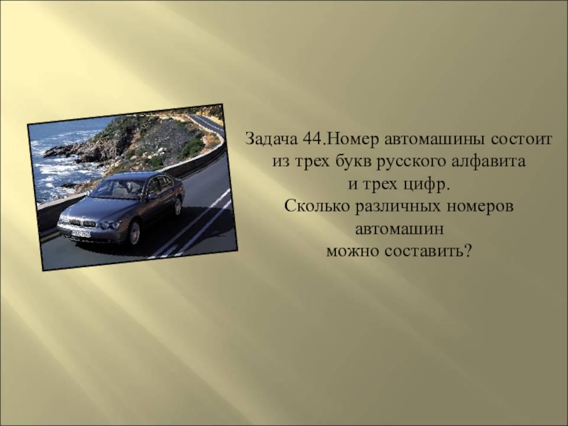 Слайд 9Задача 44.Номер автомашины состоит из трех букв русского алфавита