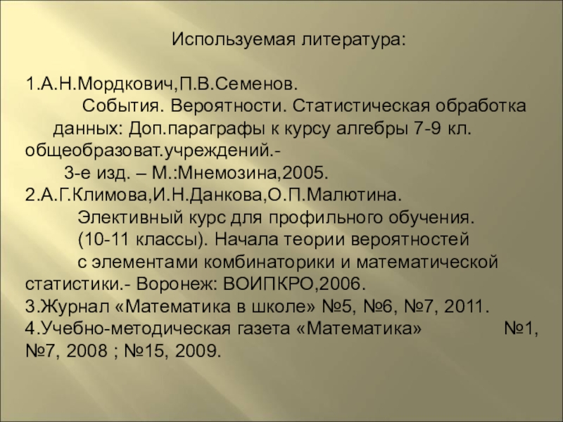 с элементами комбинаторики и математической статистики.- Воронеж: ВОИПКРО,2006.