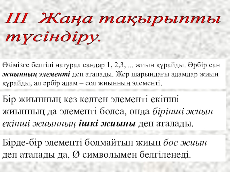 Бірде-бір элементі болмайтын жиын бос жиын деп аталады да, Ø символымен белгіленеді.