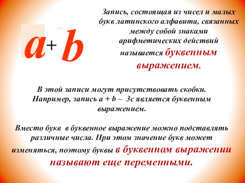 Запись, состоящая из чисел и малых букв латинского алфавита, связанных между собой знаками арифметических действий называется буквенным выражением.