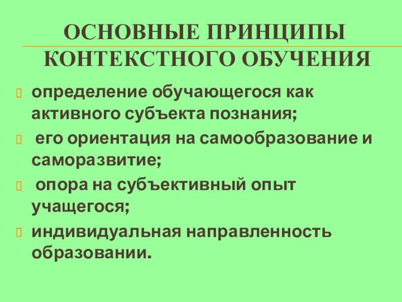 Контекстное обучение предполагает максимально широкое введение в учебный процесс видов, форм и методов деятельности, позволяющих перейти от преимущественно информационных форм к активным методам и формам обучения с включением элементов проблемности, научного поиска, широкого использования резервов самостоятельной работы обучающихся.