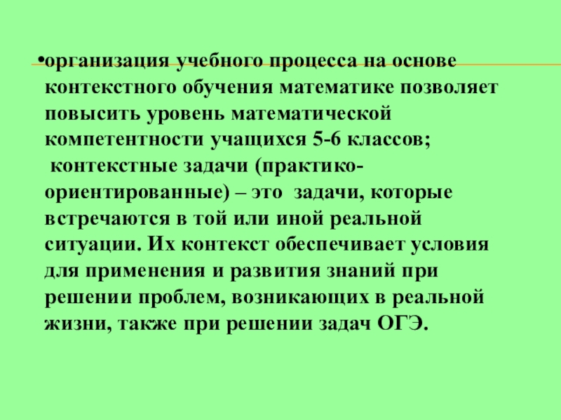Слайд 12организация учебного процесса на основе контекстного обучения математике позволяет повысить уровень