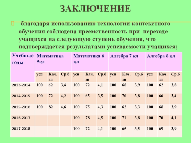 благодаря использованию технологии контекстного обучения соблюдена преемственность при переходе учащихся на