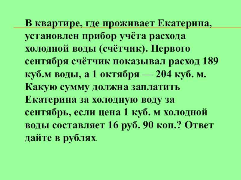 Слайд 10В квартире, где проживает Екатерина, установлен прибор учёта расхода холодной воды