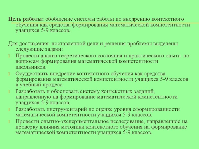 Осуществить внедрение контекстного обучения как средства формирования математической компетентности учащихся 5-9 классов в учебный процесс.