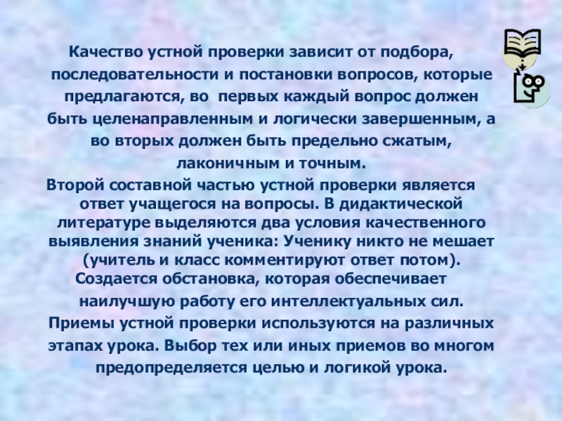 Второй составной частью устной проверки является ответ учащегося на вопросы. В дидактической литературе выделяются два условия качественного выявления знаний ученика: Ученику никто не мешает (учитель и класс комментируют ответ потом).