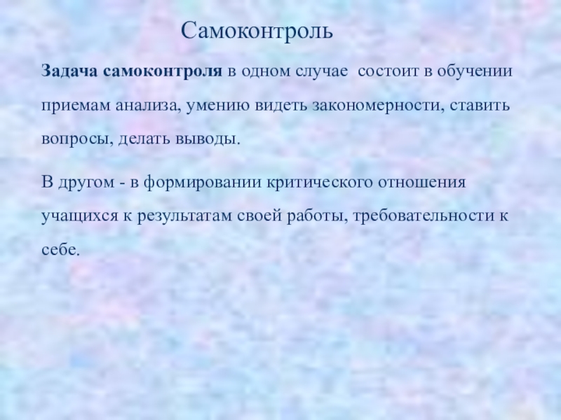 Слайд 24Задача самоконтроля в одном случае состоит в обучении приемам анализа, умению