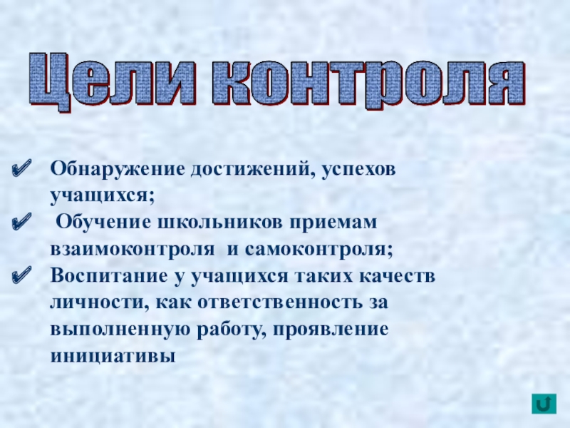 цели обучения отдельным учеником и классом в целом – насколько усвоен и как глубоко изучен учебный материал. Контроль ориентирует учащихся в их затруднениях и достижениях.