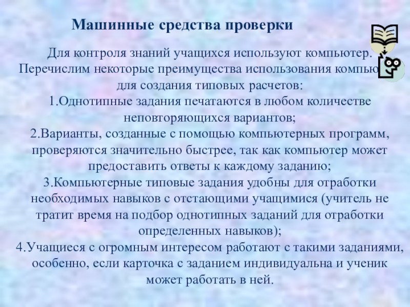 3.Компьютерные типовые задания удобны для отработки необходимых навыков с отстающими учащимися (учитель не тратит время на подбор однотипных заданий для отработки определенных навыков);
