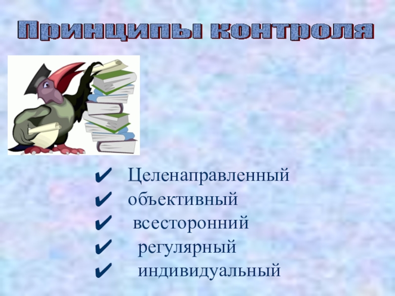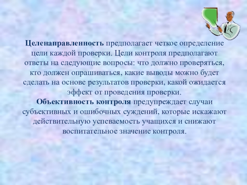 Слайд 16Целенаправленность предполагает четкое определение цели каждой проверки. Цели контроля предполагают ответы