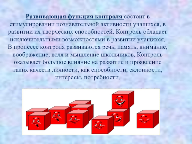 Слайд 12Развивающая функция контроля состоит в стимулировании познавательной активности учащихся, в развитии