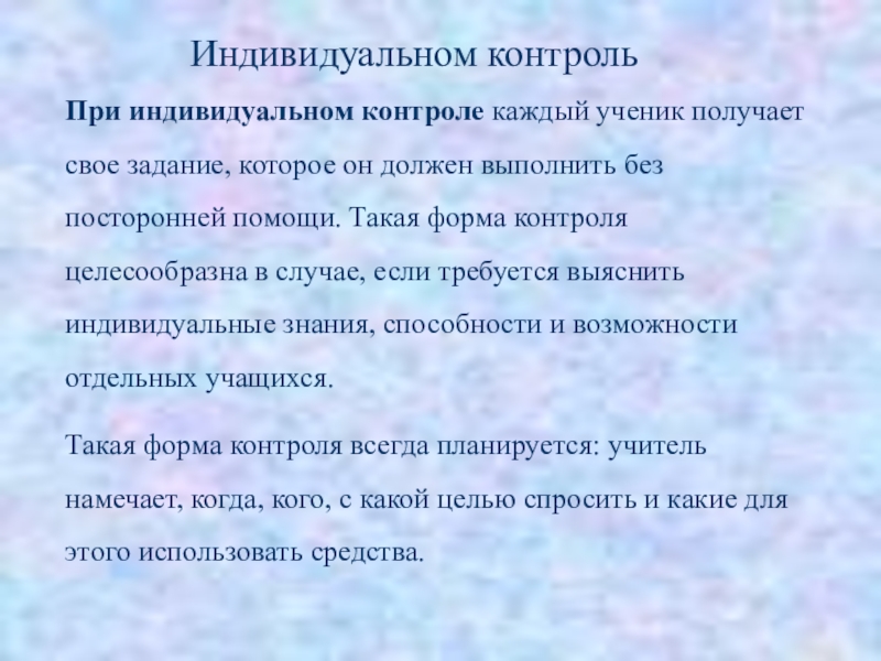 Слайд 19При индивидуальном контроле каждый ученик получает свое задание, которое он должен