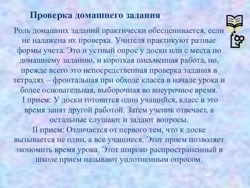 подготовку к ответу, остальным не дается время, чтобы продумать ответы на поставленные вопросы. Если вызванные учащиеся отвечают плохо, то уплотненный опрос затягивается на 15-20 минут, а других учащихся учитель вызвать не может, так как они не готовились к ответу. Кроме таких форм контроля выполнения домашнего задания существуют и другие.
