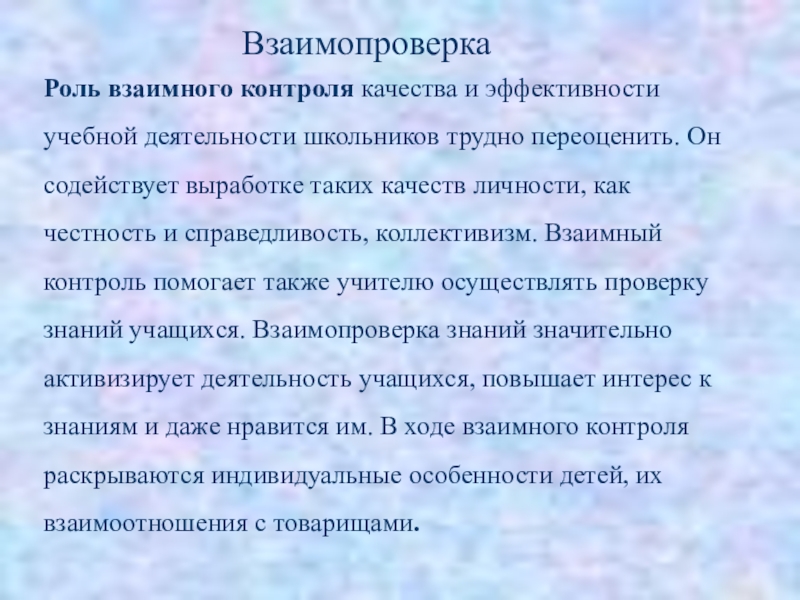 Он содействует выработке таких качеств личности, как честность и справедливость, коллективизм. Взаимный контроль помогает также учителю осуществлять проверку знаний учащихся. Взаимопроверка знаний значительно активизирует деятельность учащихся, повышает интерес к знаниям и даже нравится им. В ходе взаимного контроля раскрываются индивидуальные особенности детей, их взаимоотношения с товарищами.