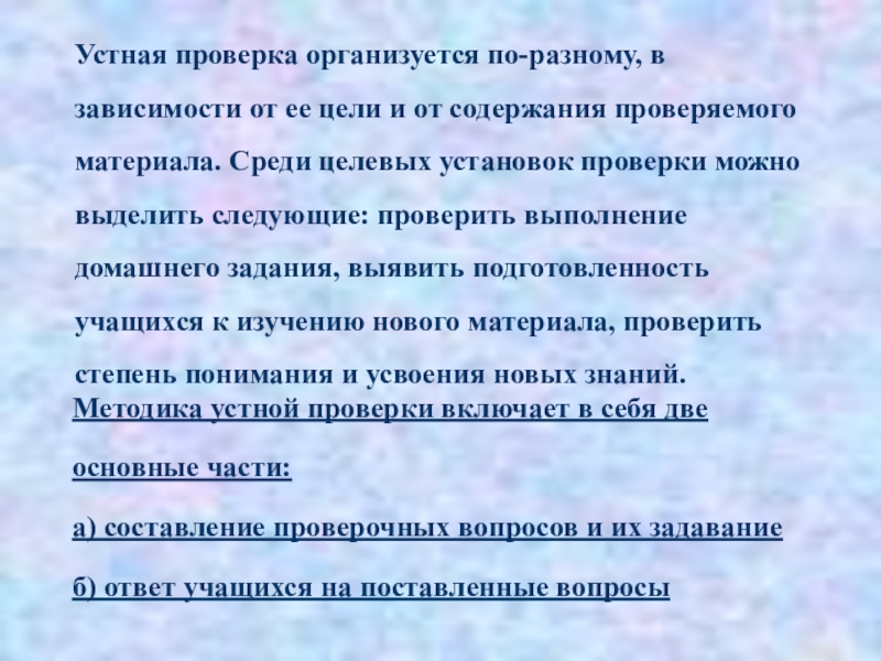 Методика устной проверки включает в себя две основные части: