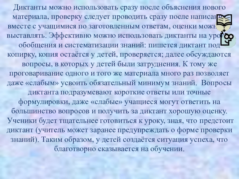 сразу после написания вместе с учащимися по заготовленным ответам, оценки можно не выставлять. Эффективно можно использовать диктанты на уроках обобщения и систематизации знаний: пишется диктант под копирку, копия остаётся у детей, проверяется; далее обсуждаются вопросы, в которых у детей были затруднения. К тому же проговаривание одного и того же материала много раз позволяет даже «слабым» усвоить обязательный минимум знаний. Вопросы диктанта подразумевают короткие ответы или точные формулировки, даже «слабые» учащиеся могут ответить на большинство вопросов и получить за диктант хорошую оценку. Ученики будет тщательнее готовиться к уроку, зная, что предстоит диктант (учитель может заранее предупреждать о форме проверки знаний). Таким образом, у детей создаётся ситуация успеха, что благотворно сказывается на обучении.