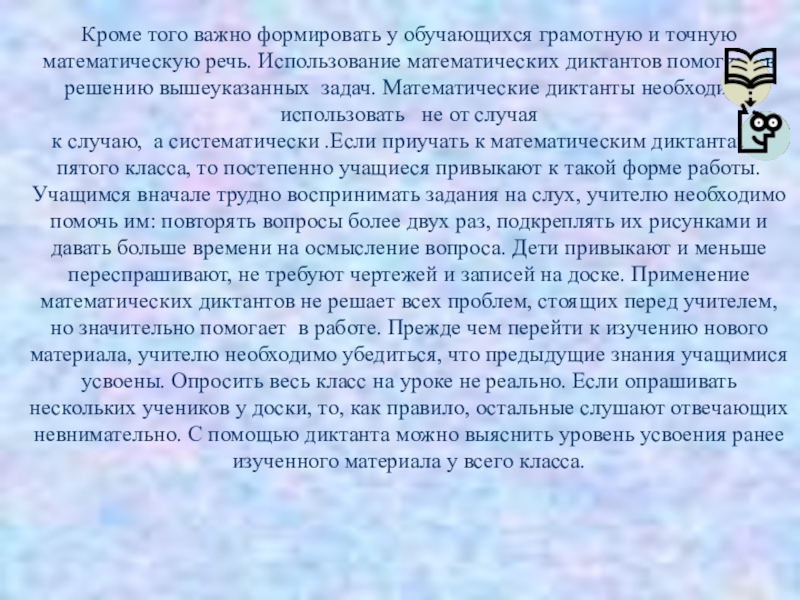 к случаю, а систематически .Если приучать к математическим диктантам с пятого класса, то постепенно учащиеся привыкают к такой форме работы. Учащимся вначале трудно воспринимать задания на слух, учителю необходимо помочь им: повторять вопросы более двух раз, подкреплять их рисунками и давать больше времени на осмысление вопроса. Дети привыкают и меньше переспрашивают, не требуют чертежей и записей на доске. Применение математических диктантов не решает всех проблем, стоящих перед учителем, но значительно помогает в работе. Прежде чем перейти к изучению нового материала, учителю необходимо убедиться, что предыдущие знания учащимися усвоены. Опросить весь класс на уроке не реально. Если опрашивать нескольких учеников у доски, то, как правило, остальные слушают отвечающих невнимательно. С помощью диктанта можно выяснить уровень усвоения ранее изученного материала у всего класса.