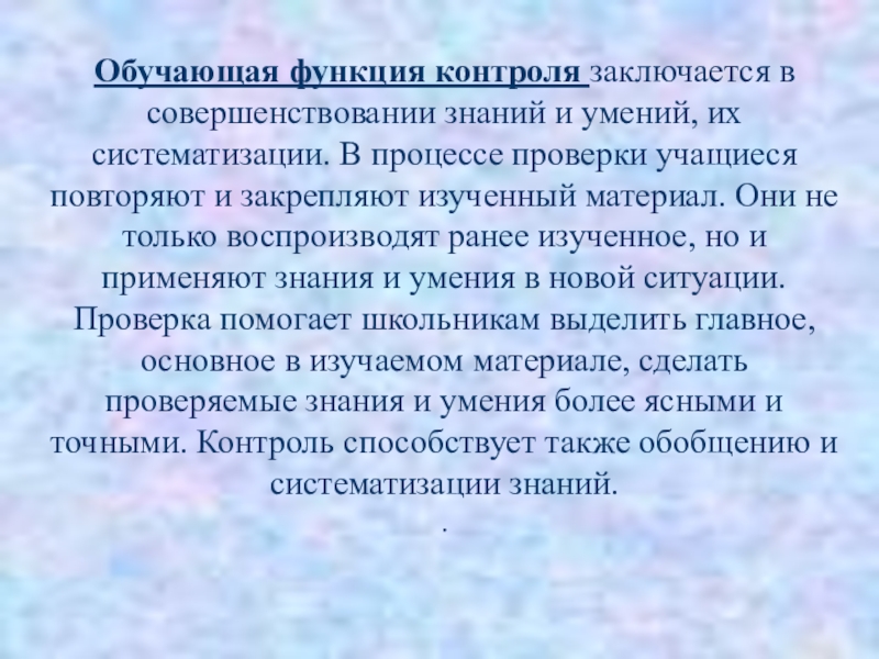Проверка помогает школьникам выделить главное, основное в изучаемом материале, сделать проверяемые знания и умения более ясными и точными. Контроль способствует также обобщению и систематизации знаний.