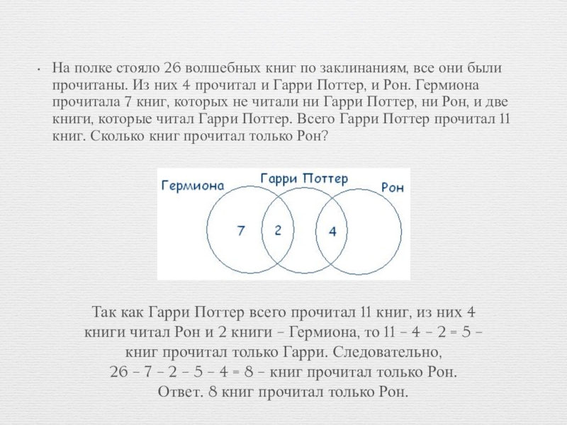 26 – 7 – 2 – 5 – 4 = 8 – книг прочитал только Рон.