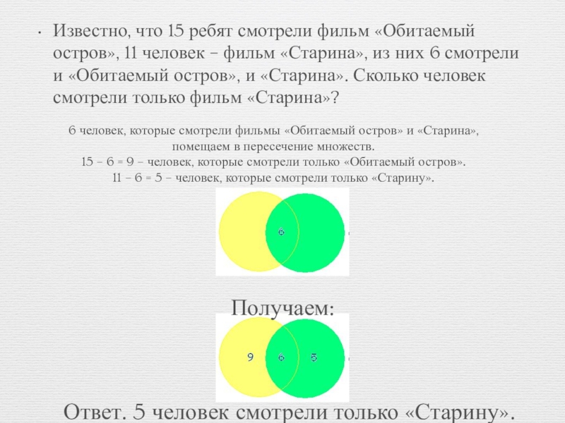 11 – 6 = 5 – человек, которые смотрели только «Старину».