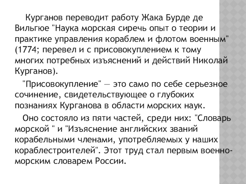 Слайд 15 Курганов переводит работу Жака Бурде де Вильгюе "Наука морская