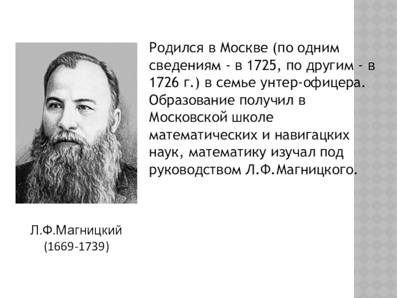 - в 1726 г.) в семье унтер-офицера. Образование получил в Московской школе математических и навигацких наук, математику изучал под руководством Л.Ф.Магницкого.
