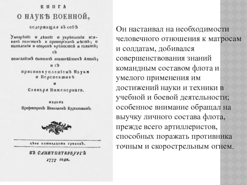 Слайд 17Он настаивал на необходимости человечного отношения к матросам и солдатам, добивался